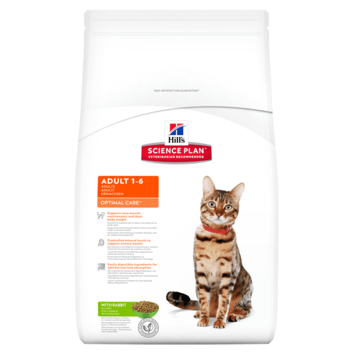 Hill's™ <span class='nowrap'>Science Plan™</span> Feline Adult <span class='nowrap'>Optimal Care™</span> with Rabbit is formulated to support optimal fitness, with clinically proven antioxidants, lean proteins and enhanced Omega 3s. <BR><BR><B>