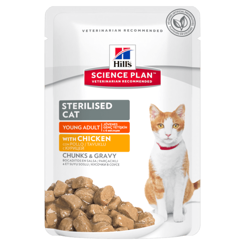 Sterilised cats are over three times more likely to become overweight and suffer with urinary problems. <br>Hill's™ <span class='nowrap'>Science Plan™</span> Sterilised Cat Young Adult Chicken is tailored to meet the needs of sterilised cats. Formulated with clinically proven antioxidants and a unique weight management formula.