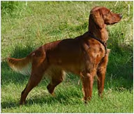 The crowning glory of the Irish setter is of course the coat, which ranges from a deep mahogany to lighter red. The coat is flat and reasonably straight (may have a little wave) and of medium length. Longer hair is found on the backs of the legs, chest and hanging off the tail. The ears have a silky fringe as well.The overall impression of the Irish setter is of glamour and elegance, although the flews (lips) are often somewhat pendulous and there may be some drooling. These tend to be hardy dogs, often living to 12 or 14 years of age.|
