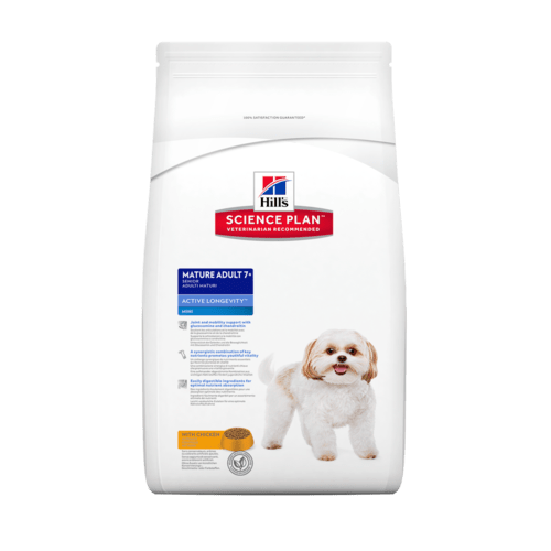 Hill's™ Science Plan™ Canine Mature Adult 7+ Active Longevity™ Mini with Chicken is formulated to sustain mobility and healthy vital organs.,for dogs who prefer a smaller kibble. With clinically proven antioxidants, and glucosamine and chondroitin from natural sources.